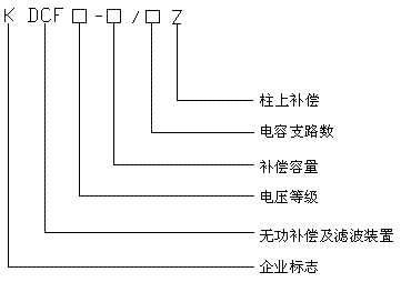 舉例說明:KDCF10-300/2Z 表明設備是10KV線路上無功補償裝置,安裝于柱上,總補償量300kvar,補償支路2路。