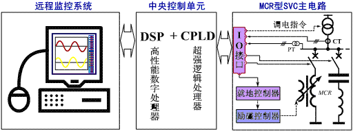 如下面的控制原理圖和系統組成圖所示,裝置主要由中央控制單元、就地控制器、勵磁控制器、磁控電抗器、電容器支路(若干)、遠程監控系統組成,當電網負荷無功需求變化時,系統可以快速連續無級調節,及時輸出無功,也可以在功率因數已經滿足要求而電網電壓波動較大時,調節控制主變壓器的分接頭,實現無功補償和電壓調節的綜合控制。
