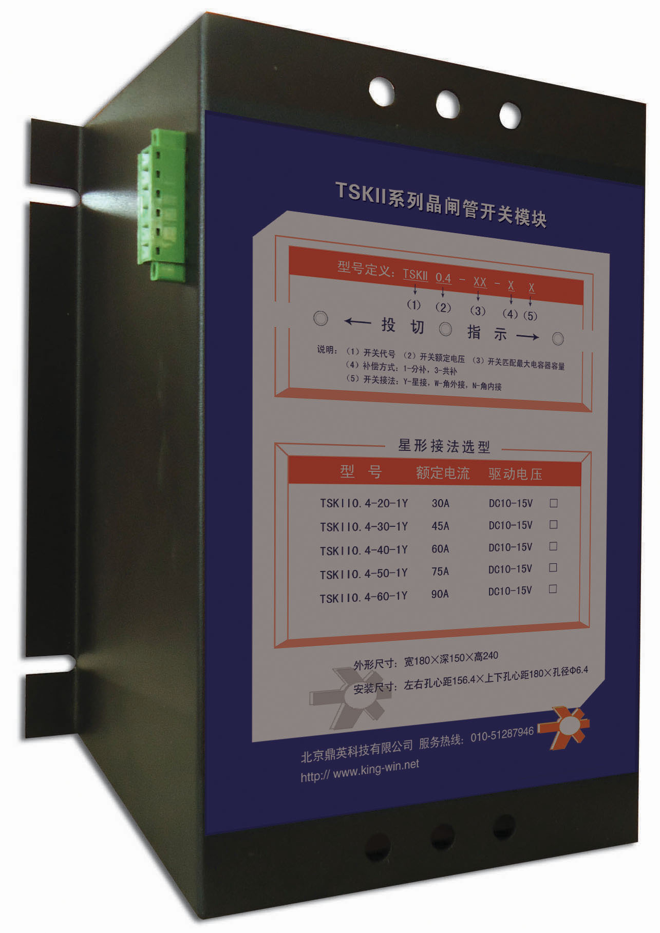 TSKII系列開關模塊是一種并聯電容器快速投切電子型功率器件,即TSC動態投切開關。該模塊采用反并聯高性能晶閘管模塊及自主設計的高性能控制電路。具有電壓過零時刻投入;電流過零時刻切除;光電隔離等特點,并引入了電壓瞬態抑制機制,保證了開關模塊工作時的安全與穩定。
